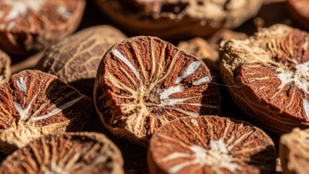 Heap of processed areca nuts cut in half revealing deep orange brown radial internal structure and dry exterior