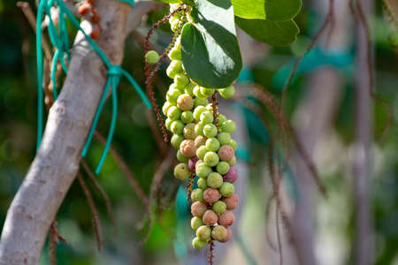 Coccoloba uvifera green tropical plant with fruits, sea grape plant close up