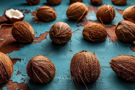 Several coconuts arranged on top of a table against a blue background.