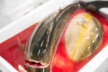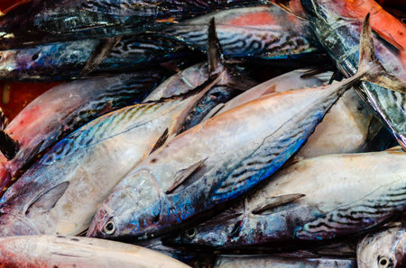 Fish market in Asia. Catching sea and ocean animals in the Indian Ocean. Tuna on shelves for sale. Exotic background