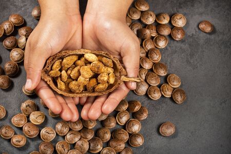 Hands holding sacha inchi peanut - Plukenetia volubilis