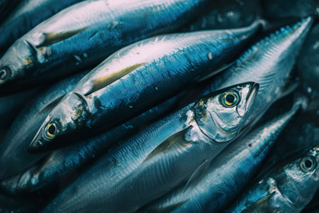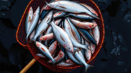 Fresh sardines caught in fishing net. for seafood market, fishing industry, Mediterranean cuisine, healthy eating, and marine life concepts.