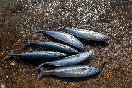 Mackerel fish on the beach. Fresh mackerel.