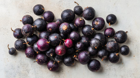 A delightful arrangement of fresh black currants on a gray surface, highlighting their rich color and natural texture, perfect for culinary and healthy lifestyle themes.