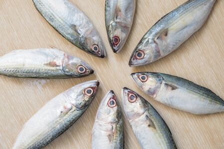 Close up Group of Fresh sea fish on wooden table