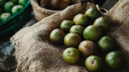 A collection of fresh green fruits resting on burlap fabric showcases a rustic market style. Ideal for natural food themes, this image embodies freshness and organic appeal.