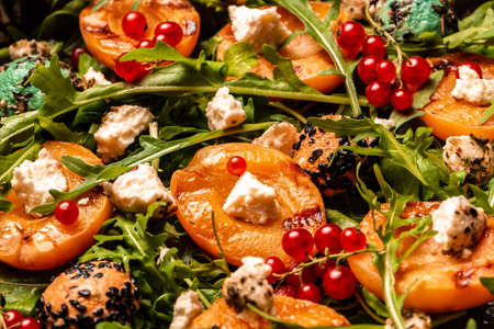 Closeup of grilled peaches salad with berries and goat cheese, Food recipe background.