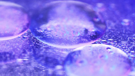 Oil bubbles. Serum gel. Defocused neon purple blue color glitter transparent emulsion texture paint water mix abstract art background.