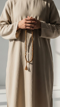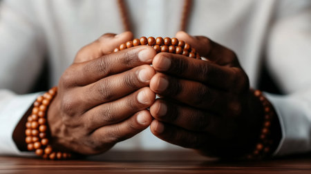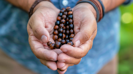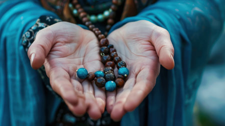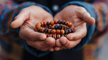 Close-up of hands gently holding beautifully crafted prayer beads, symbolizing spirituality and inner peace with a vibrant soft backdrop, evoking calmness and reflection.