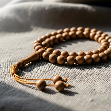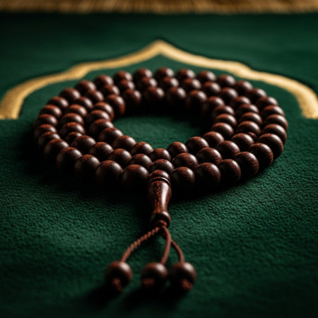 Beautifully crafted prayer beads displayed on an intricately designed carpet during a serene afternoon