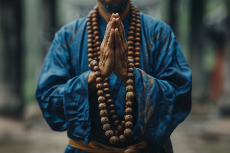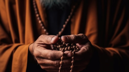 close up of a monk praying with rosary beads in hand