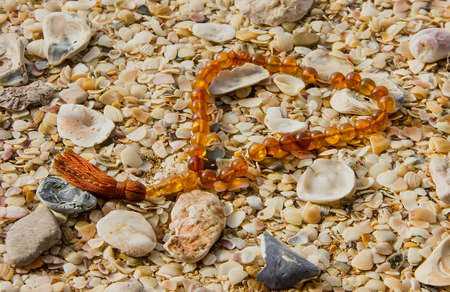 Beautiful amber beads on shells on a clear day. close up