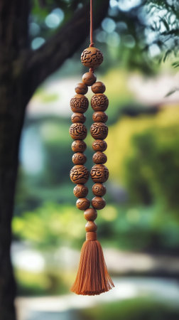 Carved wooden prayer beads with tassel hanging outdoors, spiritual serenity concept