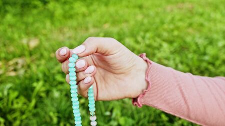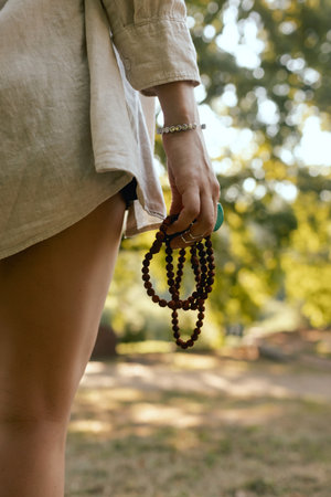 Woman lit hand close up counts rosary - malas strands of gemstones beads used for keeping count during mantra meditations. Girl sits on summer nature