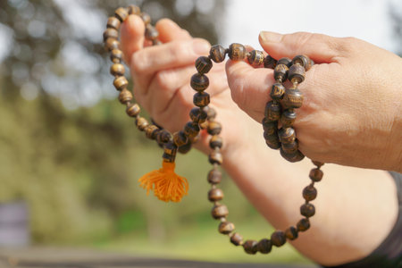 A close-up view of hands gently holding prayer beads amid a serene natural background, symbolizing meditation, mindfulness, and spiritual connection.