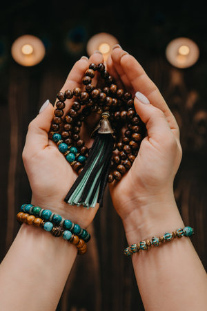Woman holding wooden mala beads strand, used during meditations. Lady sits among candles. Spirituality, religion, God concept.