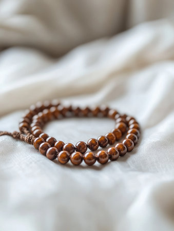 Elegant brown prayer beads on soft fabric background