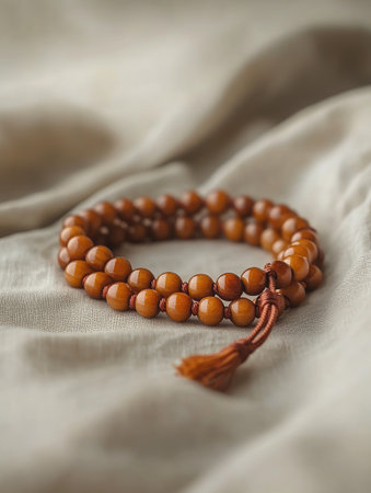 Close up of elegant prayer beads on soft fabric for spiritual reflection