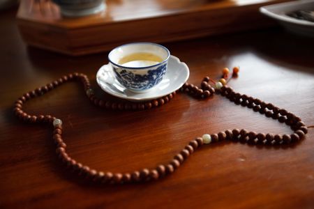 Buddhist prayer beads on a wooden table with a cup of coffee