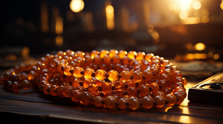 close-up of prayer beads on a wooden surface, created with generative ai