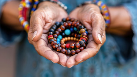 A close-up view of hands gracefully holding colorful wooden beads and bracelets, showcasing intricate details and warm tones that evoke a sense of tranquility.