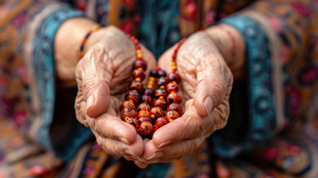 An intimate close-up of elderly hands gently cradling vibrant prayer beads, showcasing deep spirituality and rich cultural tradition, inviting reflection and peace.