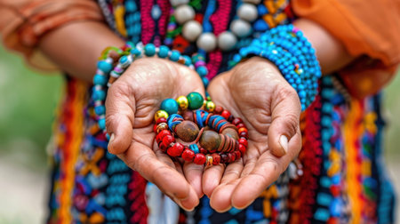 A close-up view of open hands showcasing vibrant handcrafted beaded jewelry against a colorful textile background, highlighting rich cultural artistry.