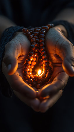 Human hands are carefully holding a string of prayer beads with fire light effect, displaying spirituality against a dark, transparent backdrop.