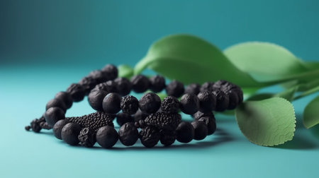 Black rosary beads with leaves on blue background, closeup