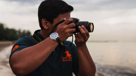 Kota Kinabalu, Sabah - January 7, 2019: An adult man taking a picture of the ocean at Tanjung Aru Beach in Kota Kinabalu during the sunset with his Nikon camera.