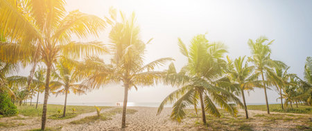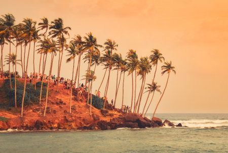 Palm trees in Varkala tropical beach at sunset, Kerala, South India