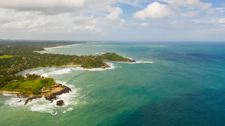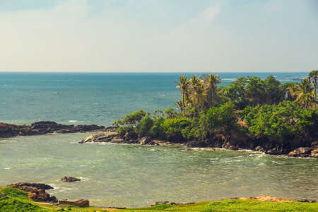 A beautiful high key tropical landscape of the ocean and rocky coastline from a headland near the beach resort village of Mirissa, Sri Lanka
