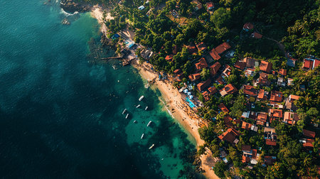Aerial shot of a vibrant coastal village nestled between lush greenery and turquoise waters. Boats dot the sea, while people relax on the sandy beach, creating a serene tropical scene.