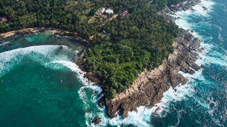 natural aerial drone bird view day shot of the sea shore with a road, beautiful villas, green trees, yellow sand, turquoise blue water, big waves and foam crashing on the beach. Pitiwella, Sri Lanka