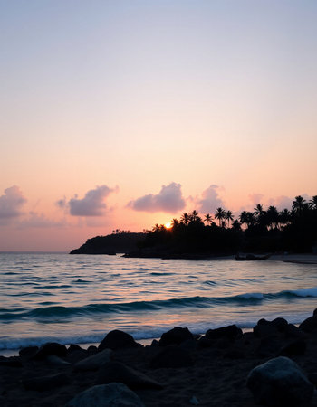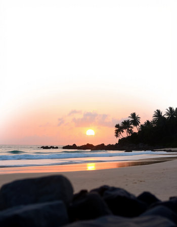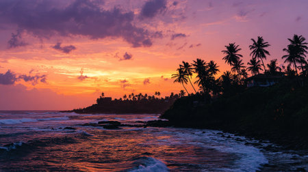 A coastal landscape features palm trees and ocean waves under a colorful sunset. The image displays warm tones from the setting sun, illuminating the water and sky. Suitable for travel or tourism promotions, this scenery could be used to evoke feelings of tranquility or depict natural beauty.