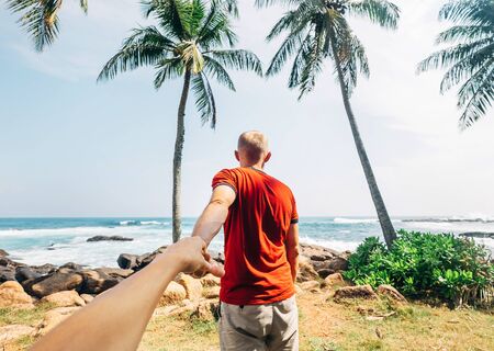 Couple holds for hands and go to ocean surf line. Together travel concept