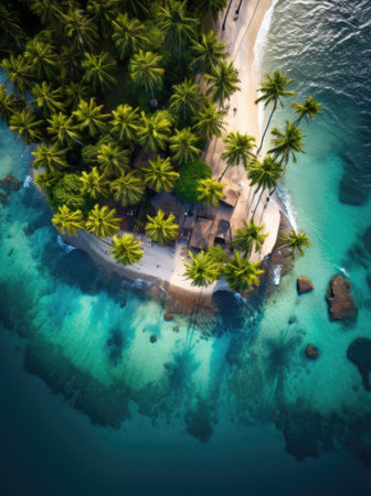 Top view of beautiful white sand beach with turquoise sea water and palm trees, aerial drone shot