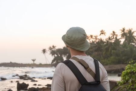 Scenic view of traveler wearing hat and backpack, gazing at ocean during sunset. Palm trees, rocky shore, ocean and serene atmosphere. Travel summer vacation.