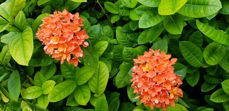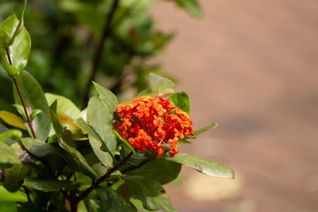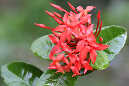 Beautiful bouquet of Spike, red or Ixora flower blooming in botany garden - Beauty of Nature, Growing life and Natural plant concept Scientific name of flower: Ixora coccinea