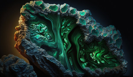 Sophisticated digital artwork presenting opulent mineral textures with intricate swirling emerald patterns and a luminous polished sheen for vivid color intensity. Ideal for luxury branding in jewelry, fashion accessories, premium packaging, and high-end interior design projects. This exotic, elegant design appeals to creative professionals in graphic arts, a... AI-generated digital illustration. AI-generated illustration.