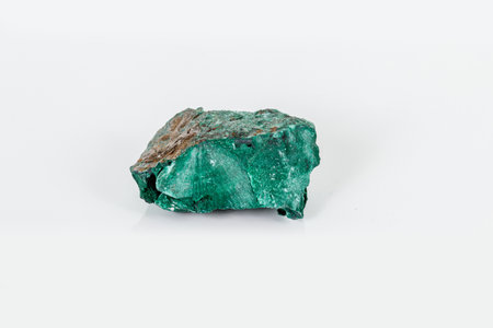 Malachite chunk stone on top of the silver surface. Randomly shaped green stone with waves and shades of green color. Malachite is a green copper carbonate mineral.Mixture of green