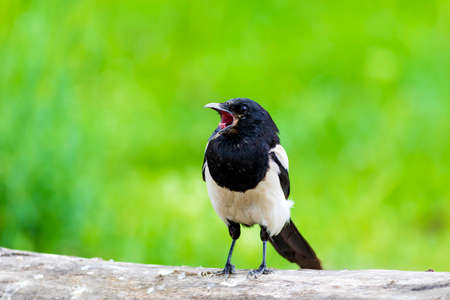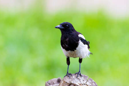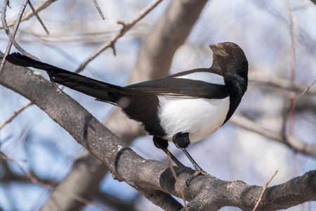 The Eurasian Magpie or Common Magpie or Pica pica is sitting on the branch with colorful background. Bird watching in early spring in March.