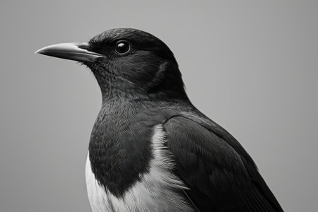 a black and white bird takes flight from the ground, showcasing the artistic style of dark emerald and light black. with a sensitivity to the natural world, the bird's plumage displays hints of light purple and light black, reminiscent of the pont-aven school. this image evokes ethical concerns and reflects a whistlerian influence, capturing the bird's exacting precision. ai generated