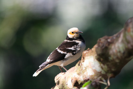 Black-collared Starling bird (Sturnus nigricollis) in a tree, green foliage background.