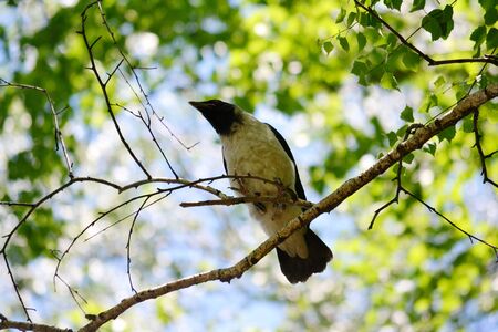 A low angle shot of a cute baby magpie bird perched on a tree branch