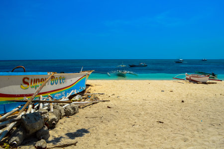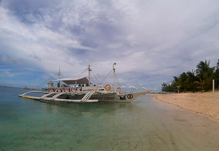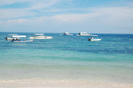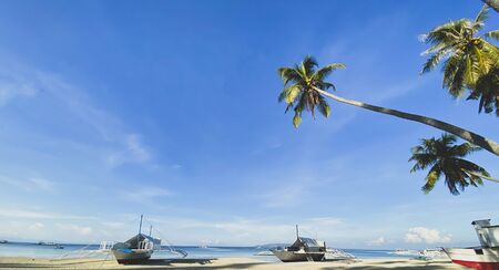 Boats at tropical white beach with sand beach of Panglao. Island, Bohol Province. Philippines