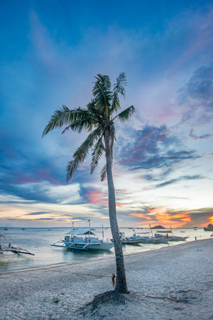 Tropical Sunset Serenity: Palm Tree and Dive Boats on Malapascua Beach