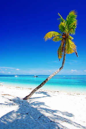 Palm tree on the white beach with a turquoise ocean and blue sky at the maldives