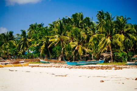 Tropical white sand beach with green palm trees and parked fishing boats in the sand. Exotic island paradise