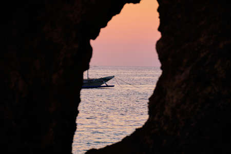 Scenic orange colored sunset on the beach with turquoise ocean surf and traditional boat on the horizon, Palawan, Philippines